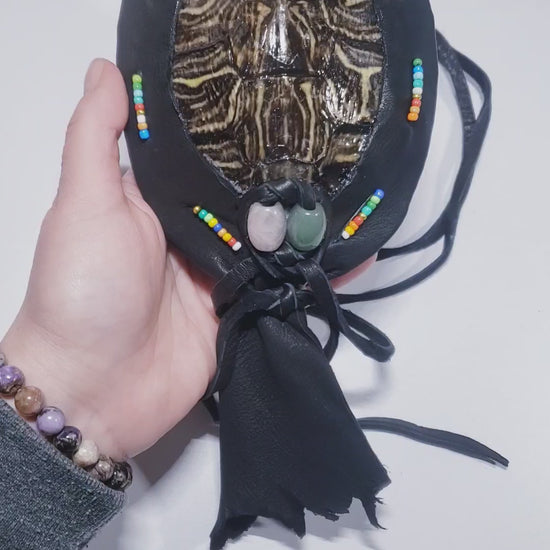 THIS LISTING IS A CUSTOM ORDER RESERVED FOR JENNIFER, THANK YOU! :) You will receive the exact item shown in this listing: (1) red eared slider turtle shell rattle with deerskin leather, green aventurine bead, rose quartz bead and seed beadwork accents. Inside the rattle are ametrine, smoky quartz and obsidian chip stone crystals.