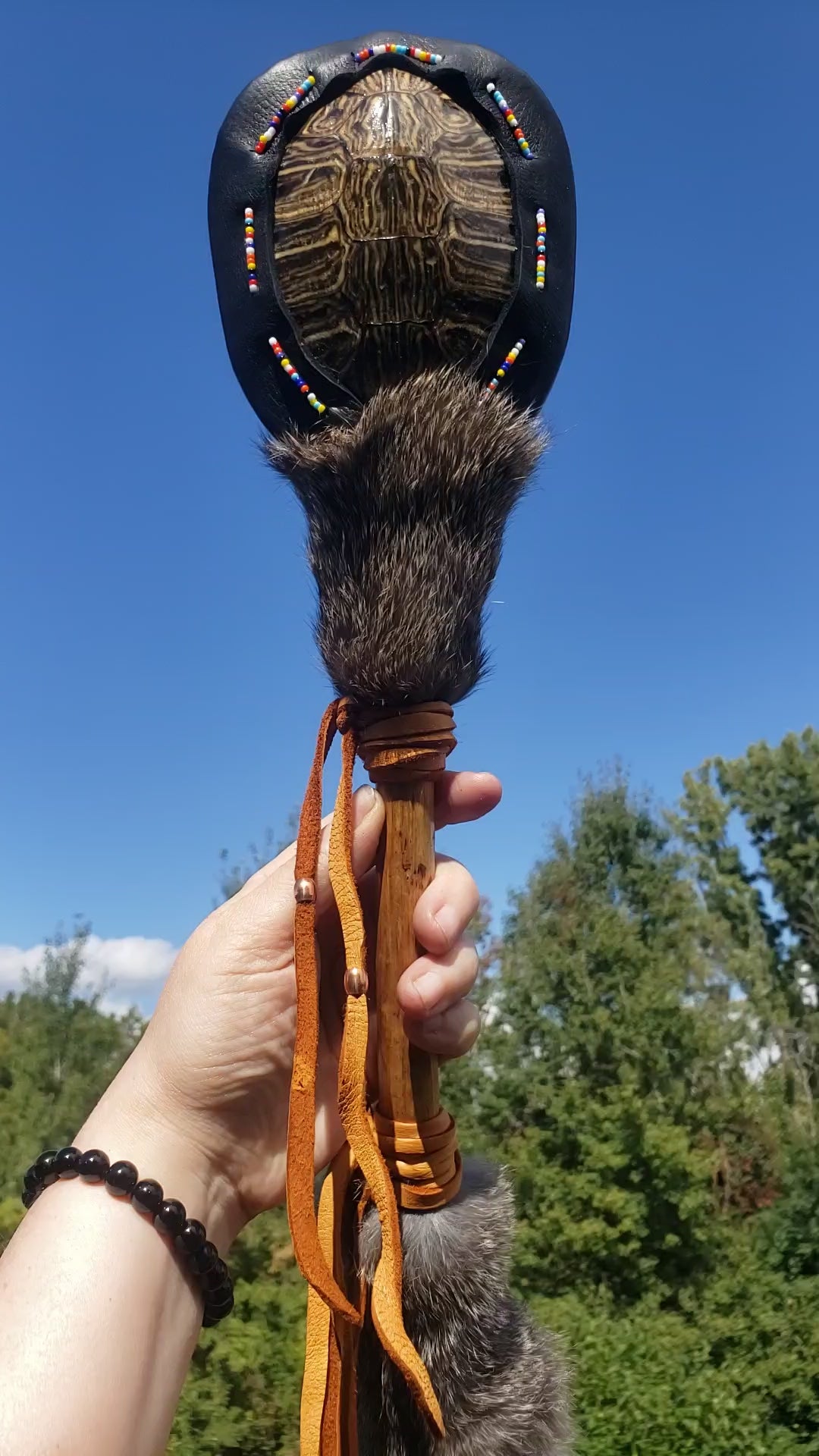 THIS LISTING IS RESERVED FOR PAT, THANK YOU! :) You will receive the exact item shown in this listing: (1) red eared slider turtle shell rattle with driftwood handle, deerskin leather, rabbit fur and seed beadwork.