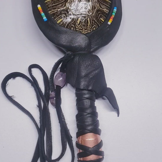 You will receive the exact item shown in this listing: (1) red eared slider turtle shell rattle with deerskin leather, copper, smoky quartz, amethyst beads and seed beadwork accents. Inside the rattle are ametrine, smoky quartz and obsidian chip stone crystals.