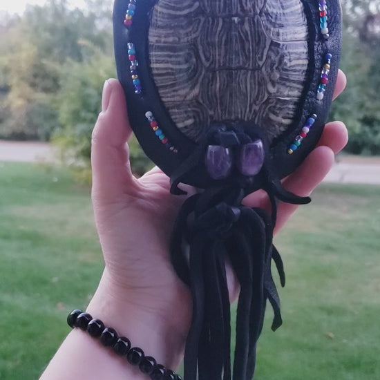 THIS LISTING IS RESERVED FOR CATHERINE, THANK YOU! :) In this listing: 1) red eared slider turtle shell with deerskin leather, amethysts and seed beadwork. 2) leather storage/travel pouch with long strap that can be worn as a crossbody.